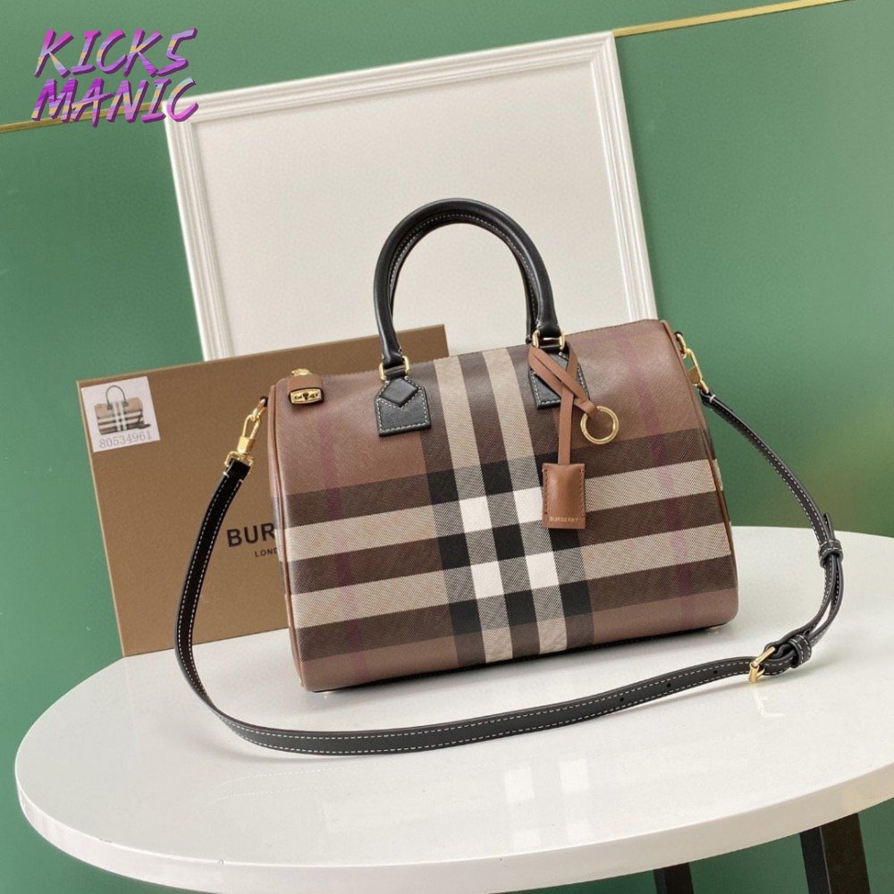 Burberry Check And Leather Medium Bowling Bag Dark Birch Brown 80523481